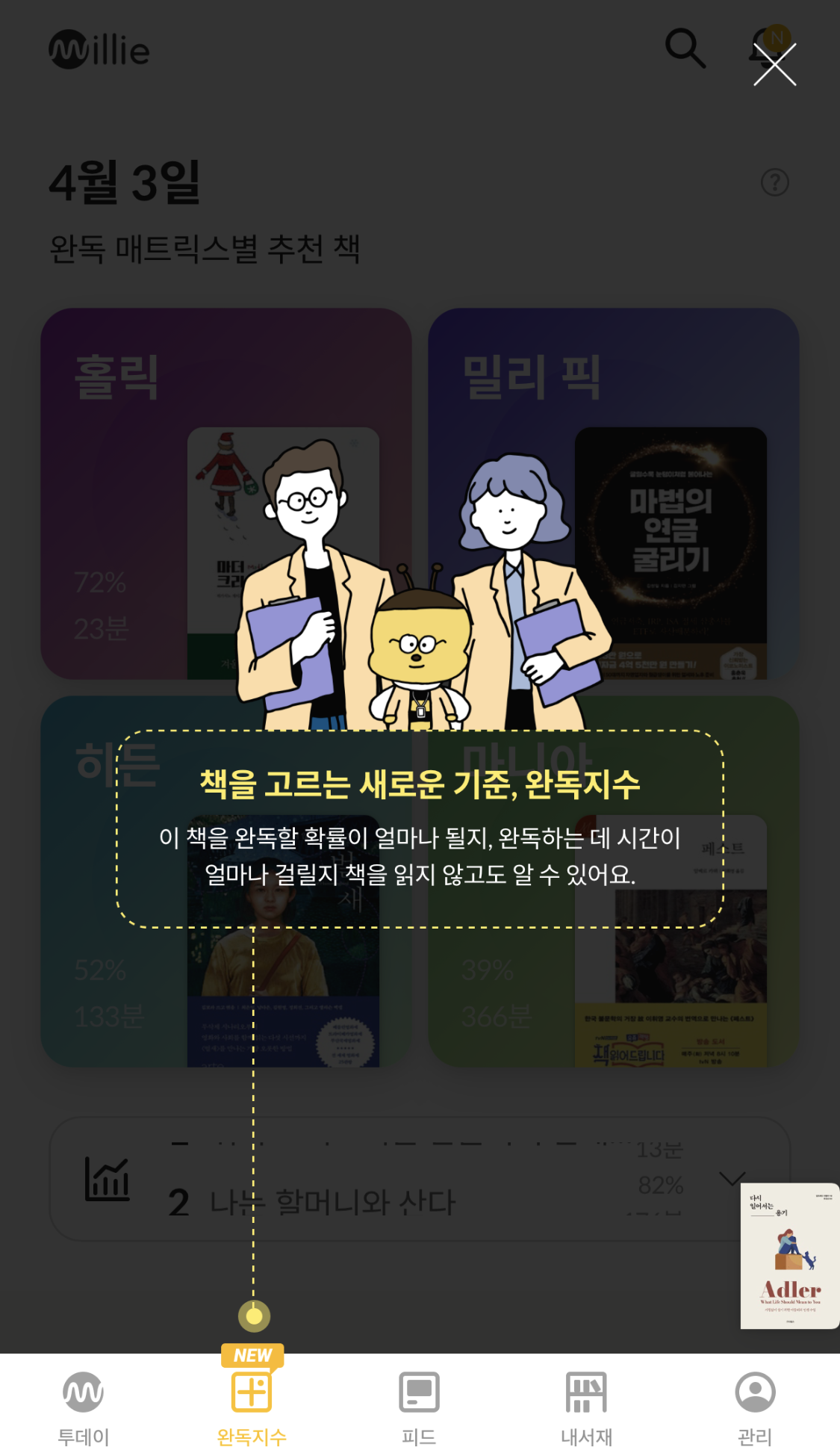 책의 리뷰등과 평점이 가능한 앱들은 많지만 완독 자수를 보여주는 앱은 얼마나 있을까요. 밀리의 앱은 완독 할 확률과 완독 하는데 걸리는 시간 등을 알 수 있도록 합니다. 그래서 책을 선택하는데 많은 도움을 주어요. 아무래도 완독률이 높은 책일수록 좋은 혹은 재미있는 책일 확률이 높겠죠?! 리뷰는 종종 개인적인 의견이 많이 들어갈 수 있지만 완독률은 얼마큼 독자들이 이 책을 좋아했는가를 여실이 보여줍니다. 저에겐 이 기능이 가장 맘에 드는 기능입니다.